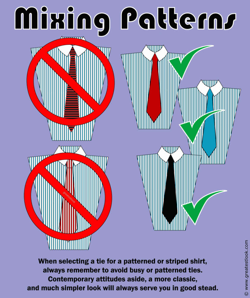 Use extreme caution when mixing patterned or striped shirts with patterned or striped ties. Modern designers and style gurus tout the “hip and funky” effect it creates, but that only works for you if you look good in hip and funky. And in most situations that call for a tie, you don’t want to look funky, you want to look classy.
